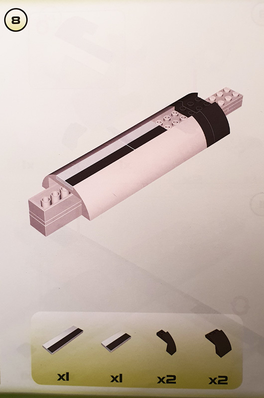 Nachdem ein Teil der Abdeckung gebaut wurde, folgt das Innenleben, bestehend aus Raketenmotor und einem Sprengkopf mit Sprengladung. Anschließend folgt die zweite Seite der Abdeckung. Bereits bei Bauschritt 8 müsst ihr aufpassen, da hier die Länge der benötigten bedruckten Fliese nicht mit einer Hilfe angegeben ist. Prompt greife ich zur falschen Fliese und muss einige Zeit später wieder rückbauen.