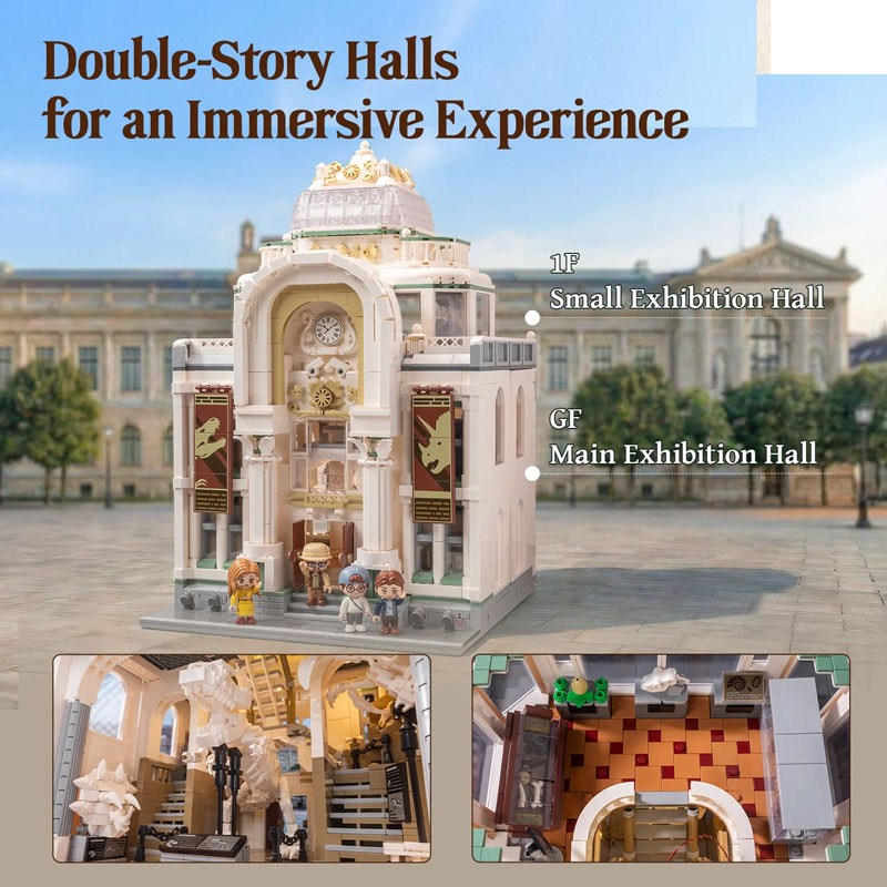 Um das Museum zum Leben zu erwecken, sind vier thematisch passende Figuren enthalten: eine Museumsführerin, ein Forscher, ein Student und ein Besucher.