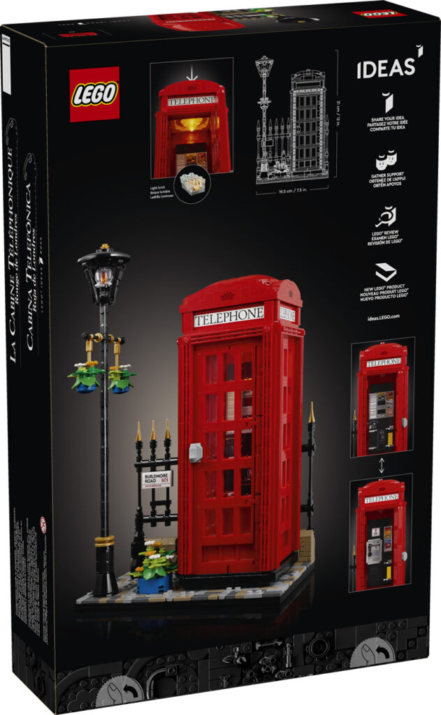 Die Telefonzelle im charakteristischen Design wird aus 1460 Steinen gebaut. Dabei ist nicht nur die eigentliche Telefonzelle Bestandteil des Sets, daneben wurden einige Elemente der Londoner Straßenkulisse integriert, beispielsweise eine Laterne mit Blumenampeln sowie ein Zaun mit Straßenschild. Die gesamte Szenerie findet auf einer gepflasterten Straße Platz.