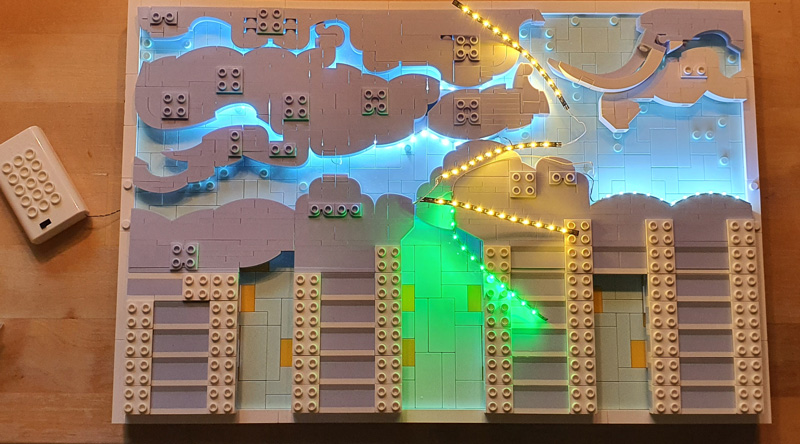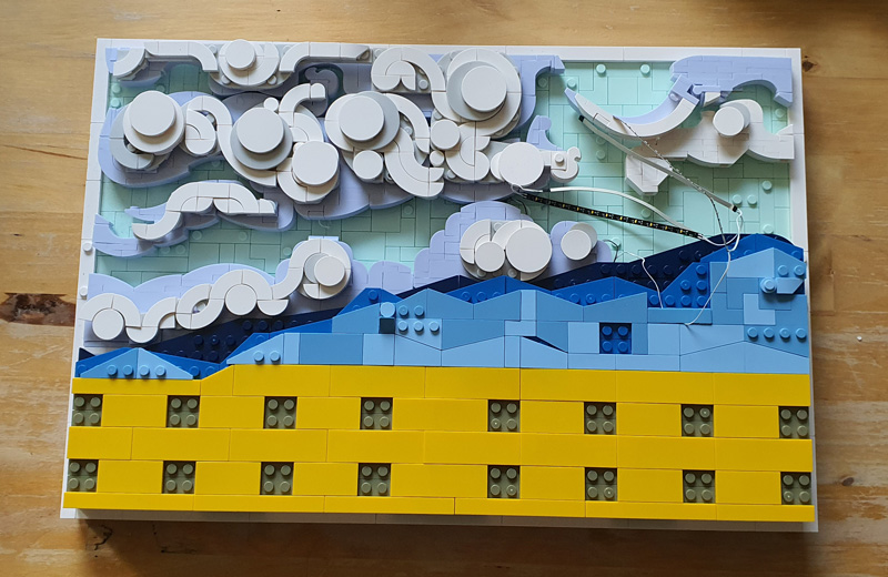 Im ersten Schritt baut ihr den Rahmen, der die Grundlage für das spätere Beleuchtungs- und Dimmsystem bildet. Danach baut ihr das eigentliche Bild, das Schicht für Schicht aufgebaut wird. Hierbei müsst ihr keine Angst haben, dass euch im Bauprozess etwas abfällt, die angebrachten Bestandteile haften sehr gut.
