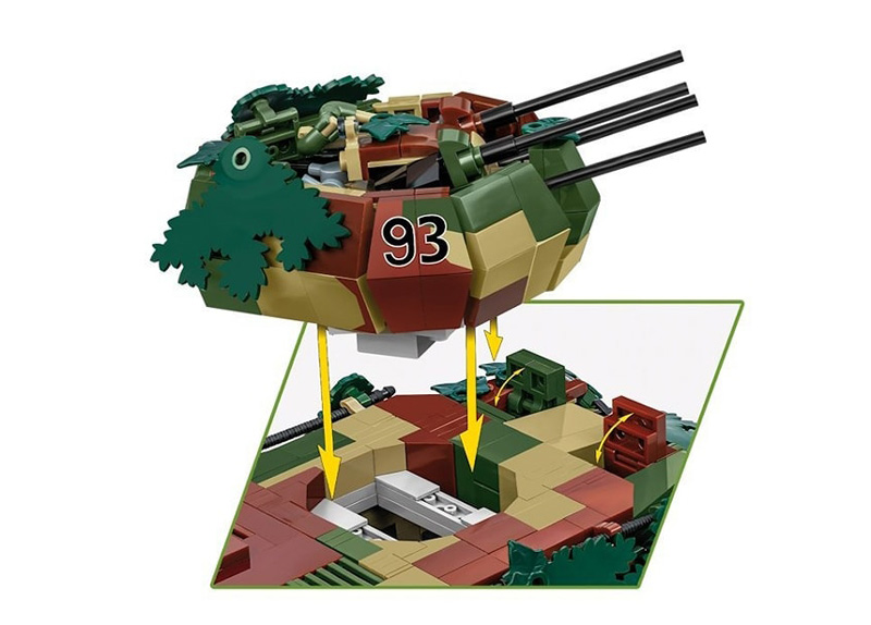 Er besteht aus 380 Teilen, ein Geländefragment sowie eine japanische Flagge sind ebenfalls dabei; genauso wie die Figur eines japanischen Panzerfahrers. COBI gibt eine UVP von 39,99 € an.