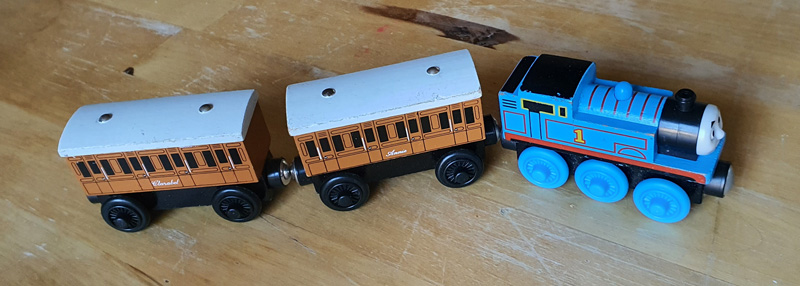 Thomas Holzeisenbahn mit seinen Passagierwaggons Annie und Clarabel